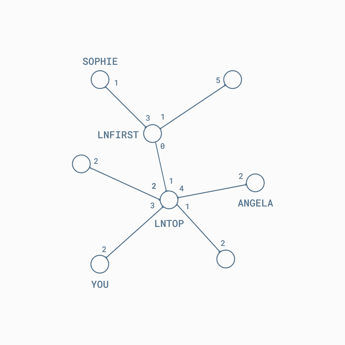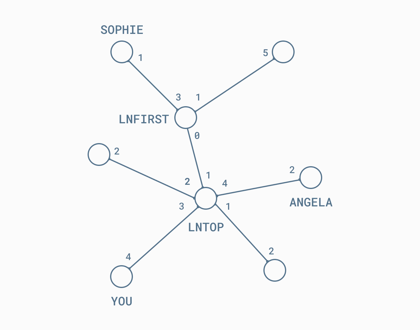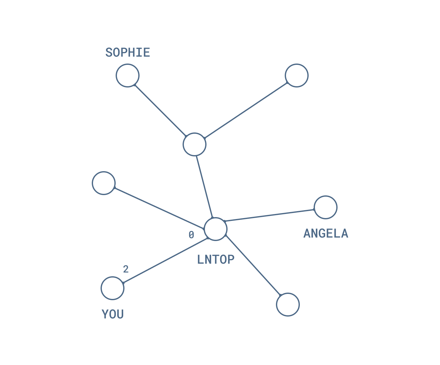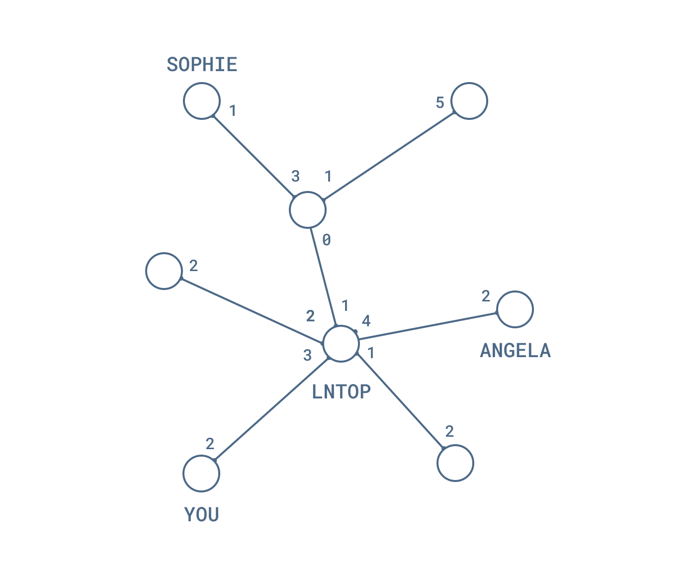 Let’s suppose you want to sell stickers via the Lightning Network. Therefore, you need to connect to at least one node of the Lightning Network. You choose it carefully, making sure it’s connected to your potential customers, Sophie and Angela. Let’s call this node lnTop.